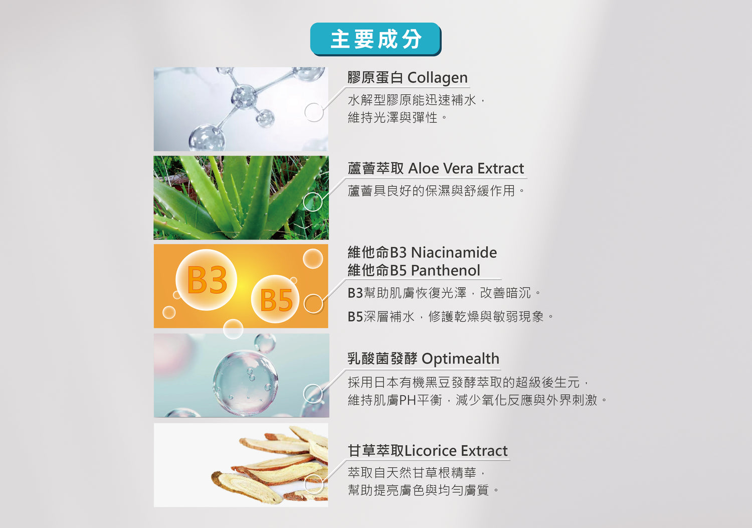 Rich in effective moisturizing and repairing ingredients, this formula combines collagen, sodium hyaluronate, vitamin B3, and vitamin B5 to help replenish skin moisture, leaving it smooth and supple while improving dryness and roughness. Blended with aloe vera leaf extract, licorice root extract, and allantoin, it gently soothes and conditions the skin for a soft, radiant appearance.