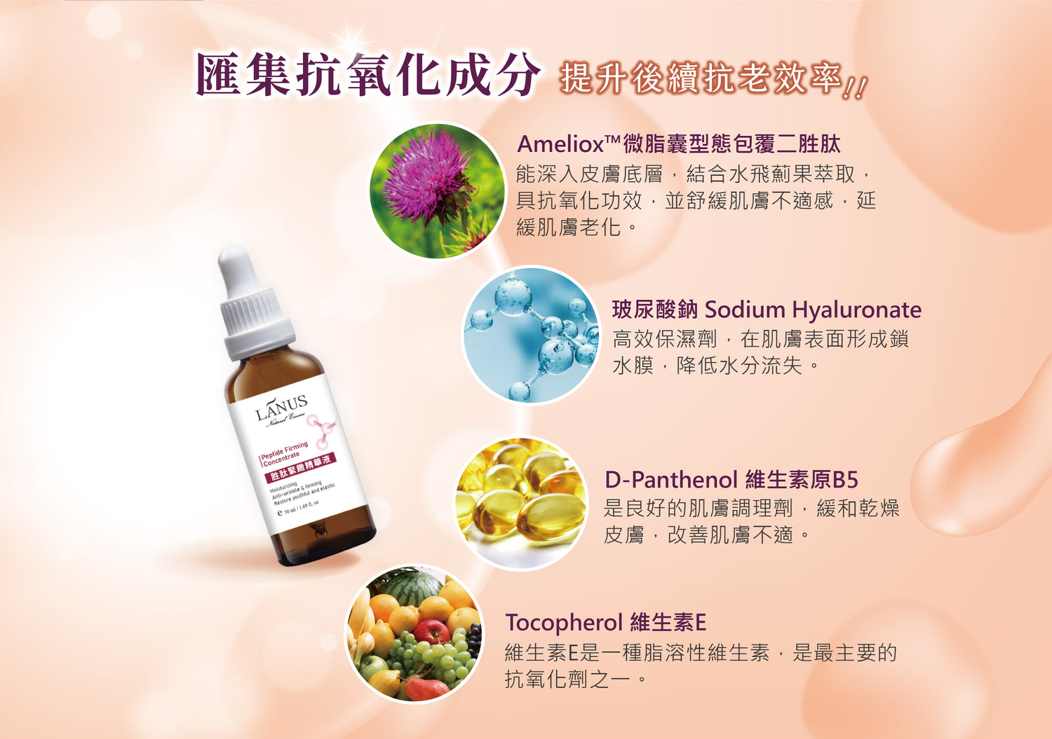 肌肽(Carnosine):具抗氧化功效,並舒緩肌膚不適感,延緩肌膚老化。