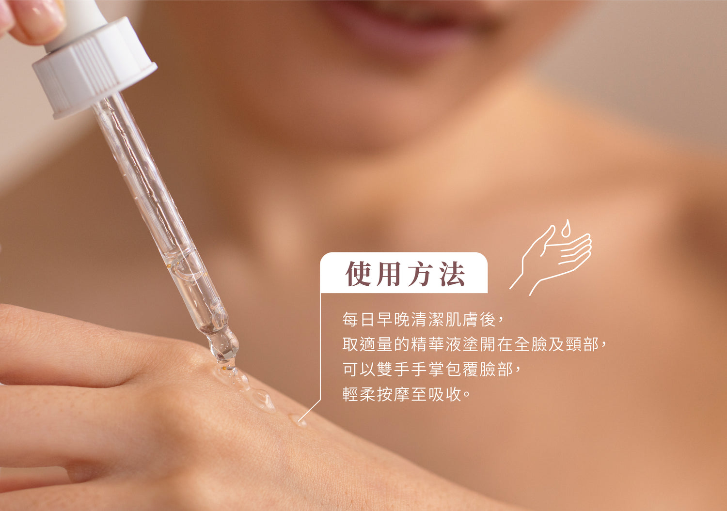 每日早晚於化妝水後使用,取適量精華液塗抹於臉部與頸部,輕拍至吸收。可搭配按摩加強緊緻效果。