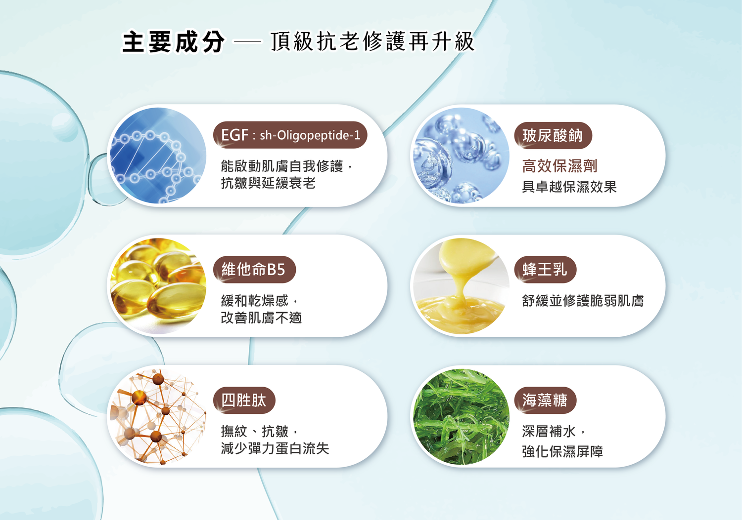 EGF表皮生長因子:啟動肌膚修護,增強彈性,延緩老化。