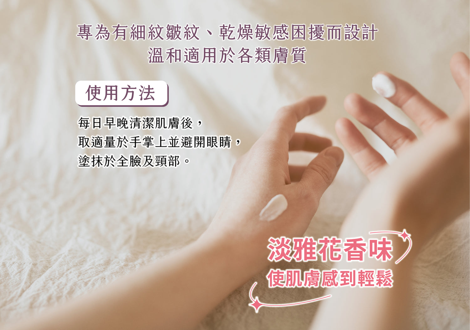 每日早晚於清潔肌膚後,取適量塗抹於臉部及頸部,稍加按摩至肌膚完全吸收
