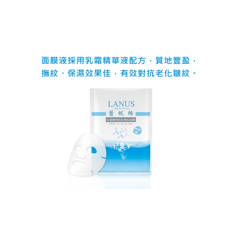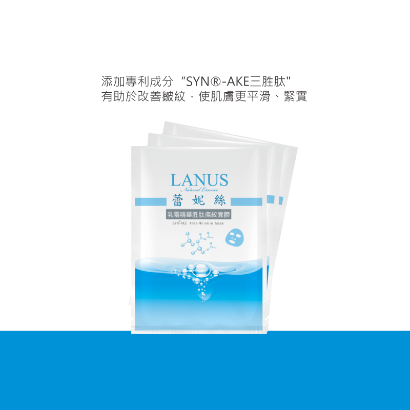 天絲材質面膜布,薄、透、貼的特性有效將精華液導入臉部肌膚。面膜液採用乳霜精華液配方,添加專利成分“SYN®-AKE三胜肽",有助於改善皺紋,使肌膚更平滑、緊實。另添加膠原蛋白、維他命B5、等緊緻抗皺成分,及多種植物萃取配方,完整對抗鬆弛細紋,質地豐盈,撫紋、保濕效果佳。