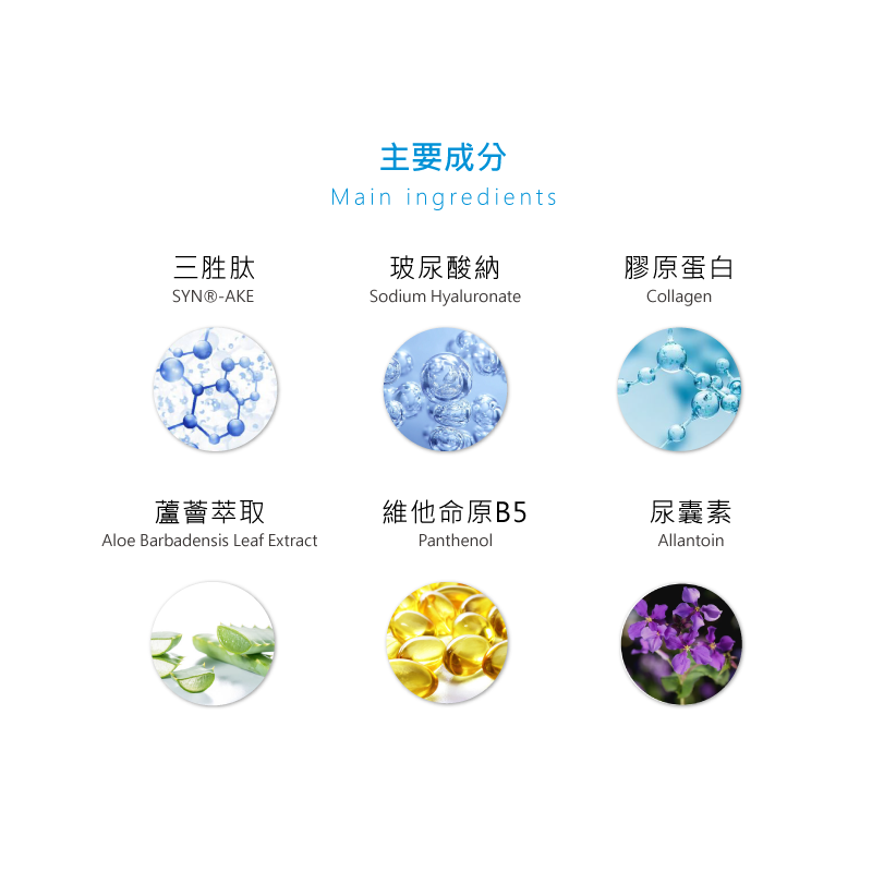 專利成分“SYN®-AKE三胜肽:有助於改善皺紋,使肌膚更平滑、緊實。