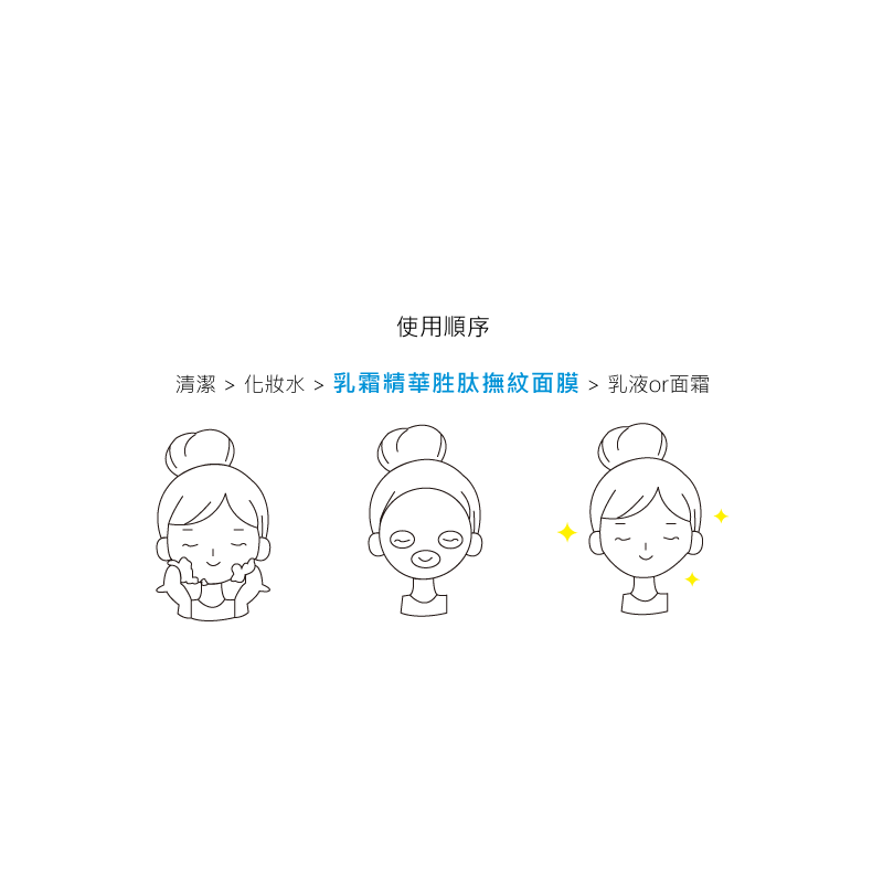 玻尿酸、維他命B5、膠原蛋白等緊緻抗皺成分,及多種植物萃取配方:完整對抗鬆弛細紋,質地豐盈,撫紋、保濕效果佳。